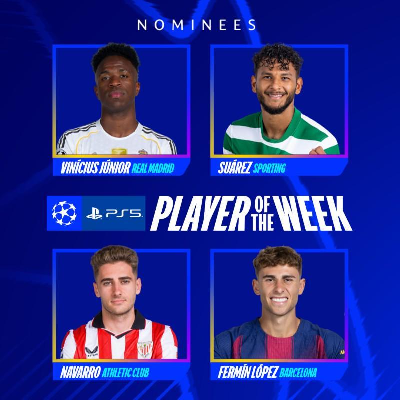 北京时间1月22日,在欧冠联赛阶段第7轮的比赛全部结束后,欧冠官方选出了本轮最佳球员的四位候选者,他们分别是皇家马德里的维尼修斯、葡萄牙体育的路易斯-苏亚雷斯、毕尔巴鄂竞技的罗伯特-纳瓦罗以及巴塞罗那的费尔明-洛佩斯。