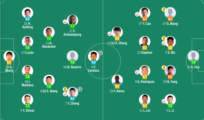中场:40-纳萨里奥(F)(95'19-杨意林)、6-王上源、13-阿卜杜肉苏力