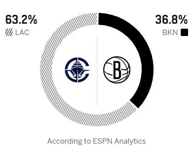 根据ESPN赛前给出的胜率预测,快船获胜概率为63.2%,而篮网则为36.8%。